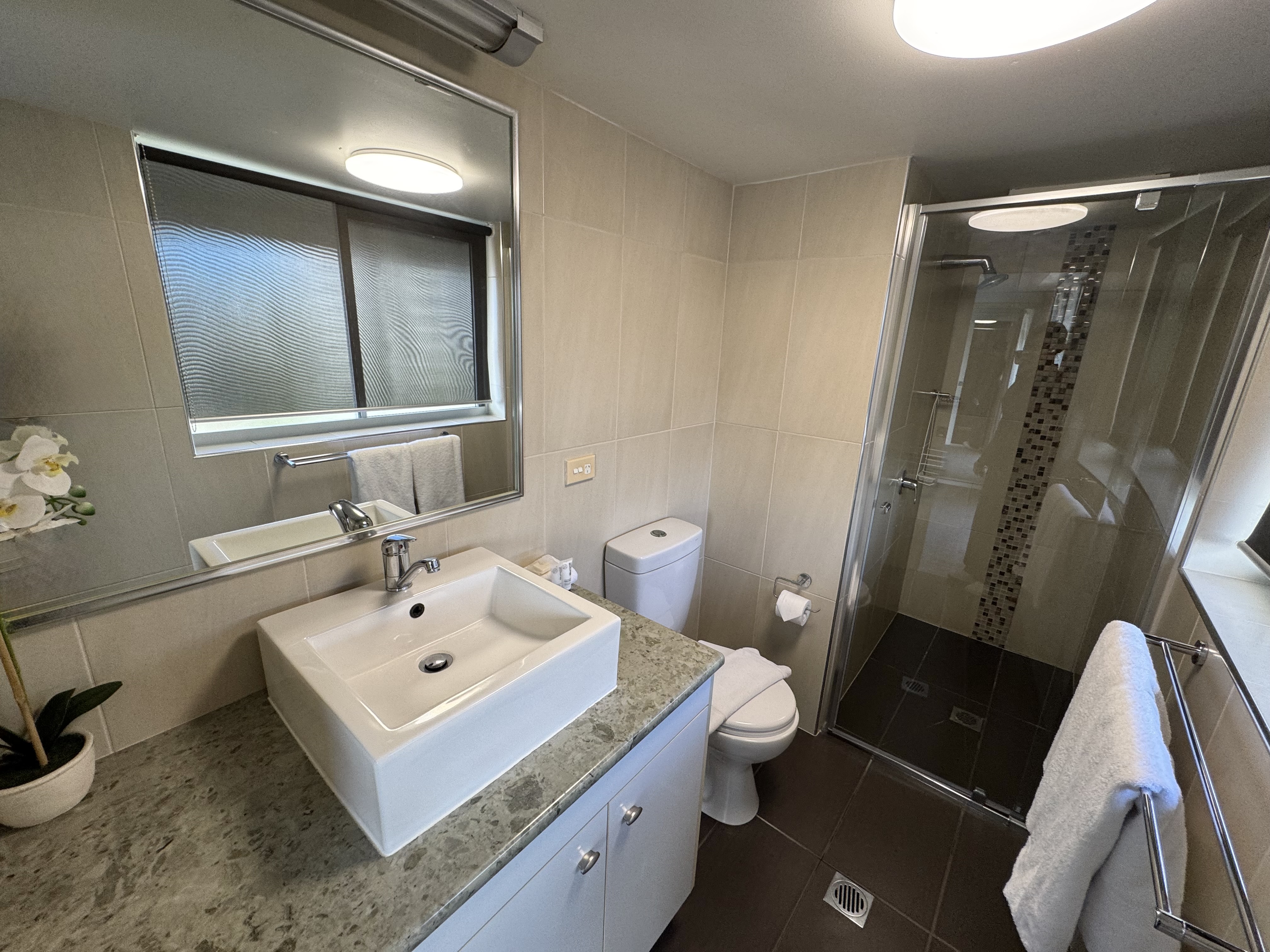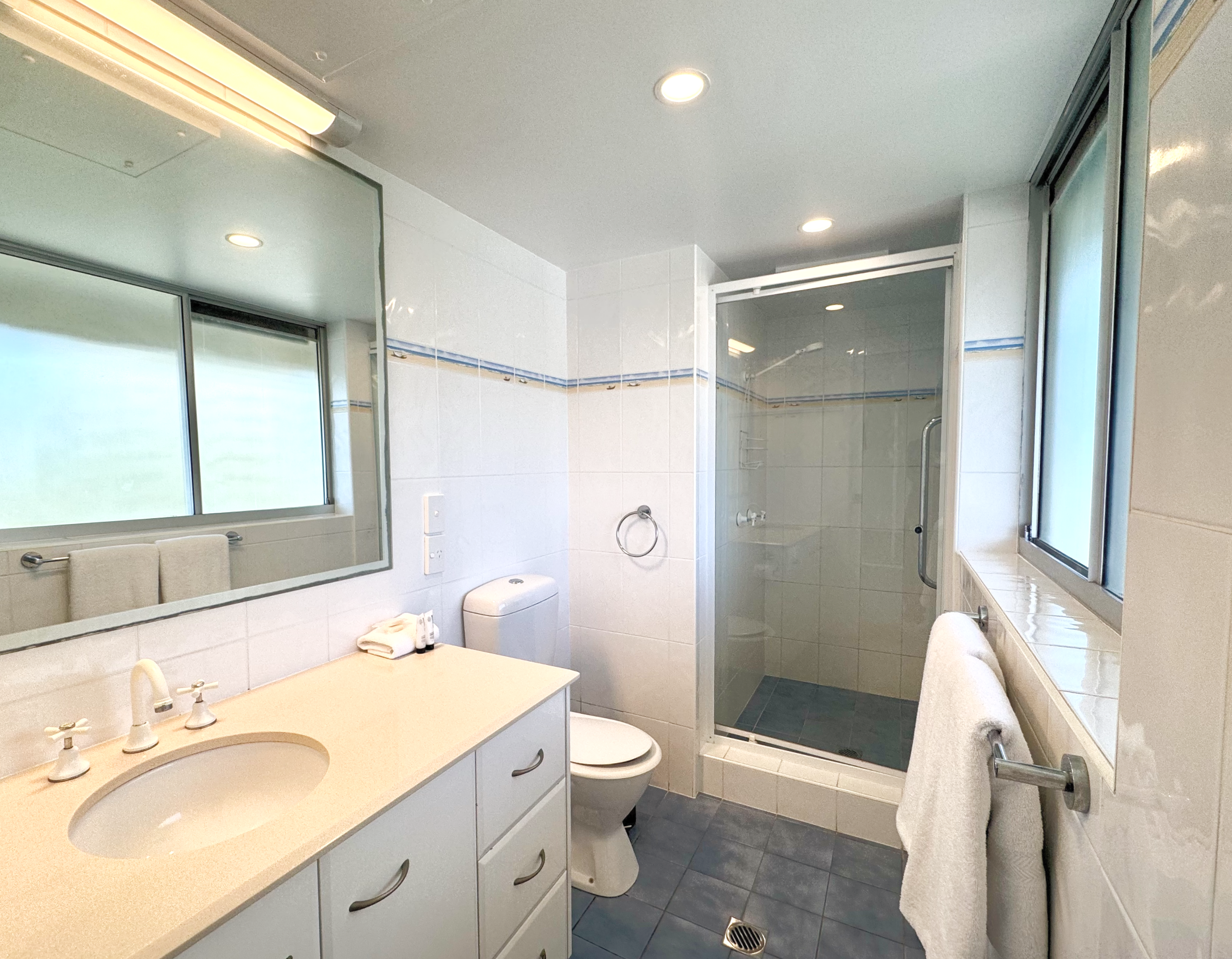 Bathroom with shower and towels provided